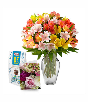 This special package includes 50 blooms of assorted colour Alstroemeria, decadent Italian chocolates by Sorini, and a full-size greeting card to personalize your gift for any occasion.