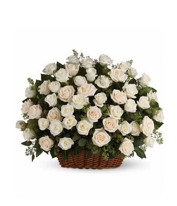 A beautiful, bountiful basket of luminous white roses that feels so fresh, natural, and welcomed in a home or at a service.