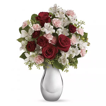 This beautiful arrangement includes red roses, red spray roses, white alstroemeria and pink miniature pink carnations with lovely greenery. Approximately 13" W x 17 1/2" H