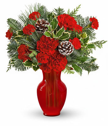 Capture the cosy magic of winter with the Crimson Pine Holiday Bouquet. Bursting with velvety red carnations and petite red mini carnations, it’s layered with fresh Christmas greens and feathery white pine, and finished with natural pine cones for a festive touch.