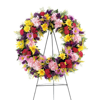 Wreaths are a traditional and appropriate choice for funerals and any commemorative event. Choose this lovely wreath of mixed flowers to show your love and support. The bright colours will provide a wonderful boost at any service.