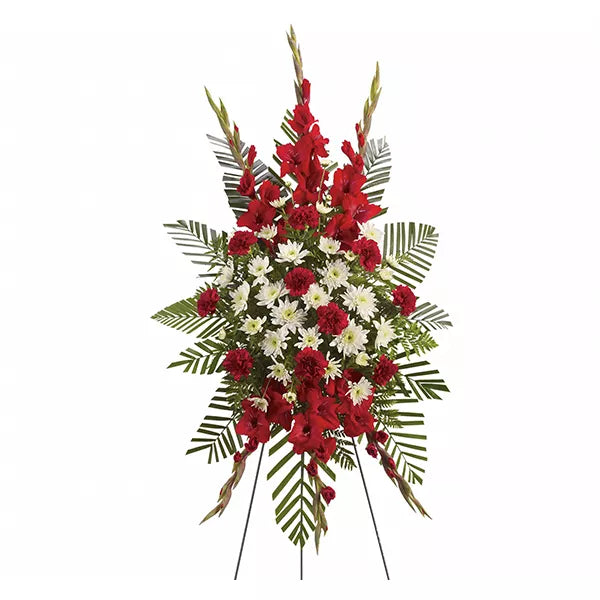 This beautiful spray of white and red blooms will show your good taste and caring. This is an impeccable selection for any memorial.
